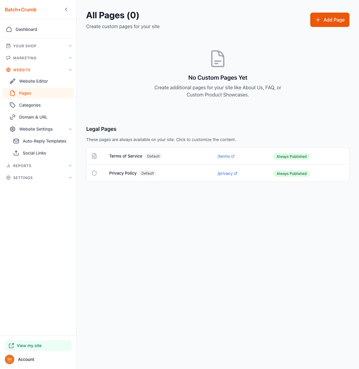 Create custom pages for your site — like an About Us, FAQ, or product showcase — and edit the built-in legal pages that come with every Batch52 site.