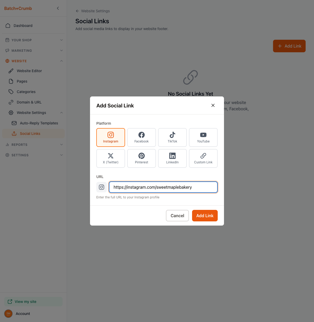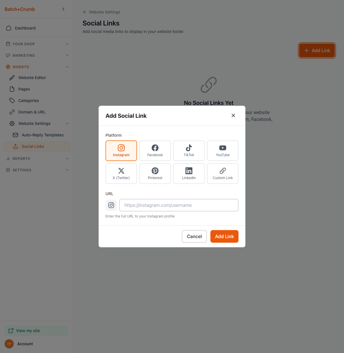 Click the + Add Link button in the top-right corner. The Add Social Link dialog appears.