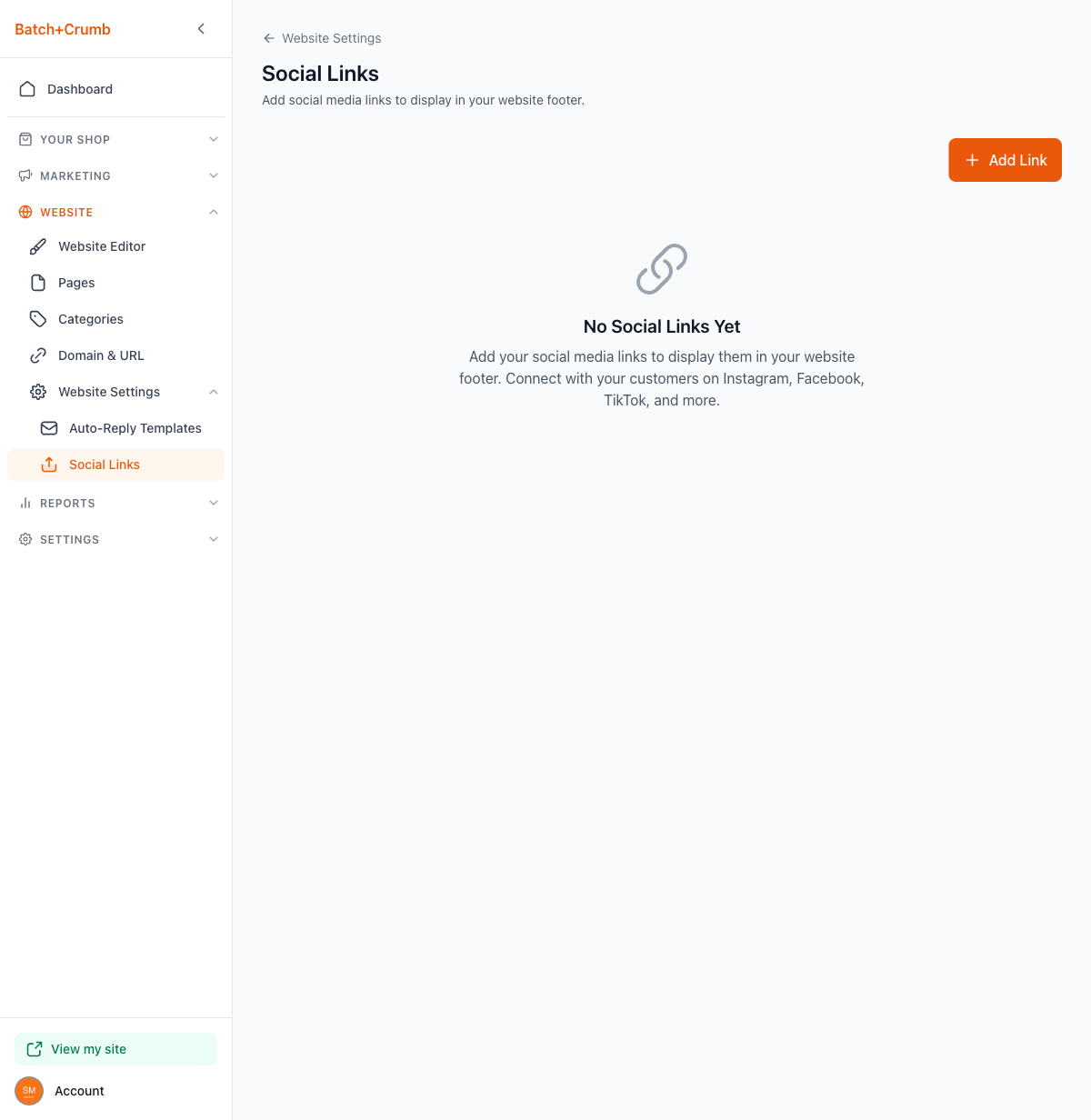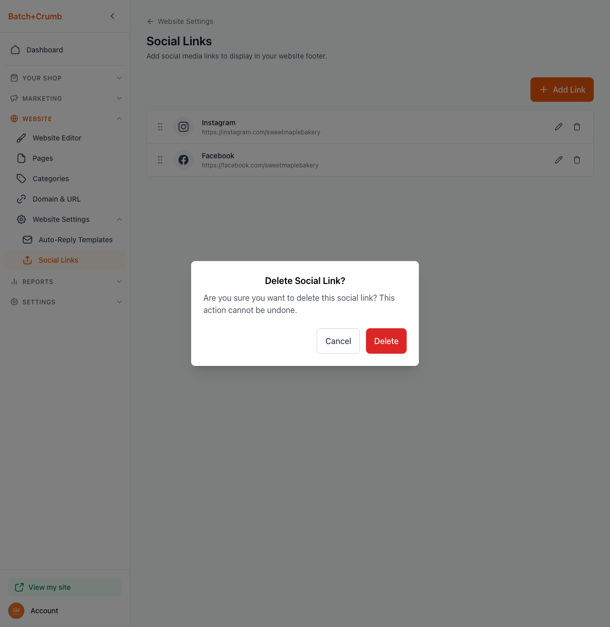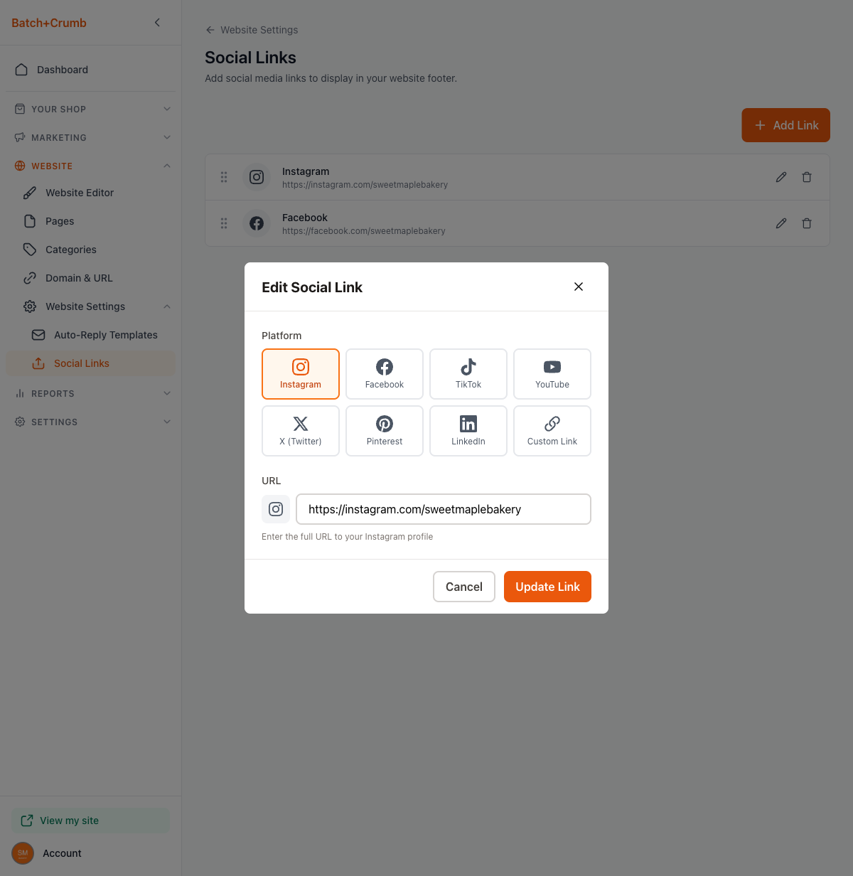 Social links appear in your website's footer, making it easy for customers to find and follow you on social media. You can add links to eight different platforms, rearrange their order, and update or remove them anytime.