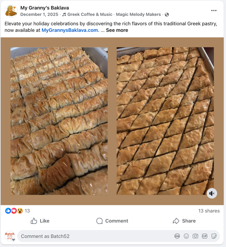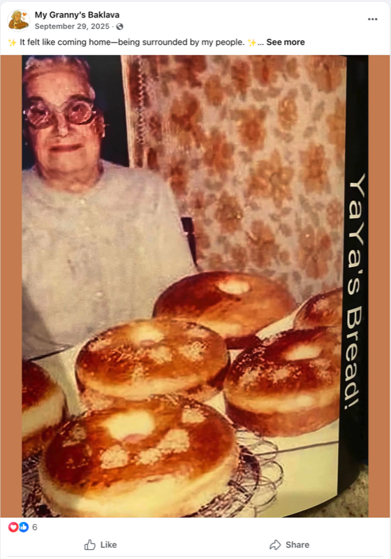Post #2: Your Story (monthly) One heritage/personal post per month. Your grandmother's recipe. Your first bake. Why this matters to you. These posts get shared and bring new customers who feel connected to your brand before they ever taste your product.