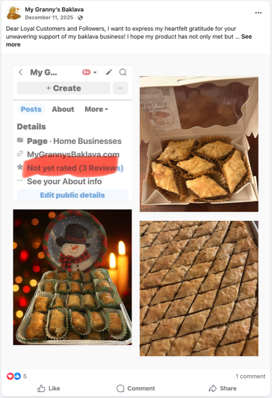 We studied a real cottage food baker — a Greek baklava business in Ohio — who went from zero to 30 paying customers and over $1,200 in revenue in five months using nothing but a Facebook page and a simple website. We analyzed every single post she made, every order she received, and every visitor to her site.