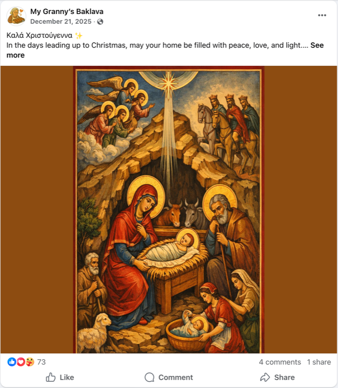 Teresa's most "viral" post by far was a Greek Christmas greeting on December 21 — a beautiful Nativity icon with "Kala Christougenna" (Merry Christmas). It received 73 reactions — more than 10x her average post.