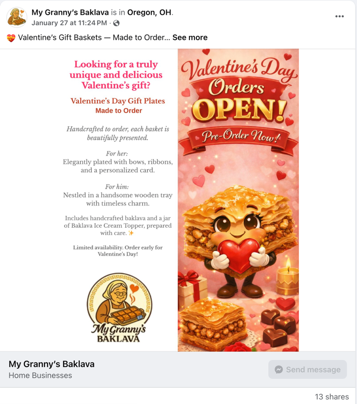 Between January 16 and 28, Teresa posted 7 Valentine's Day-themed posts — reels, gift basket flyers, "baklava is a gift of love" photo albums. Some of these got solid engagement. The January 20 post got 6 shares. A reel got 107 views.