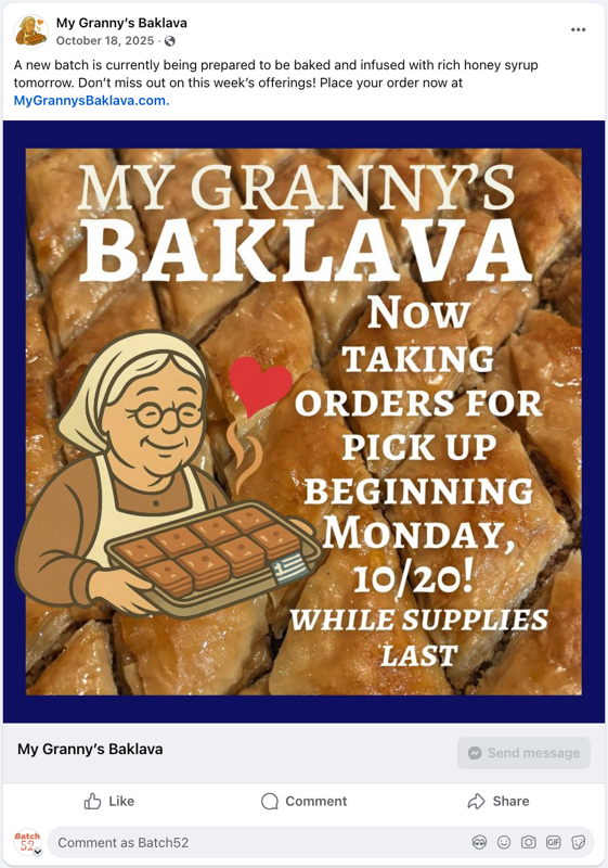Post #1: "Now Available" (every time you bake) This is your most important post. When a batch is ready, post immediately with: